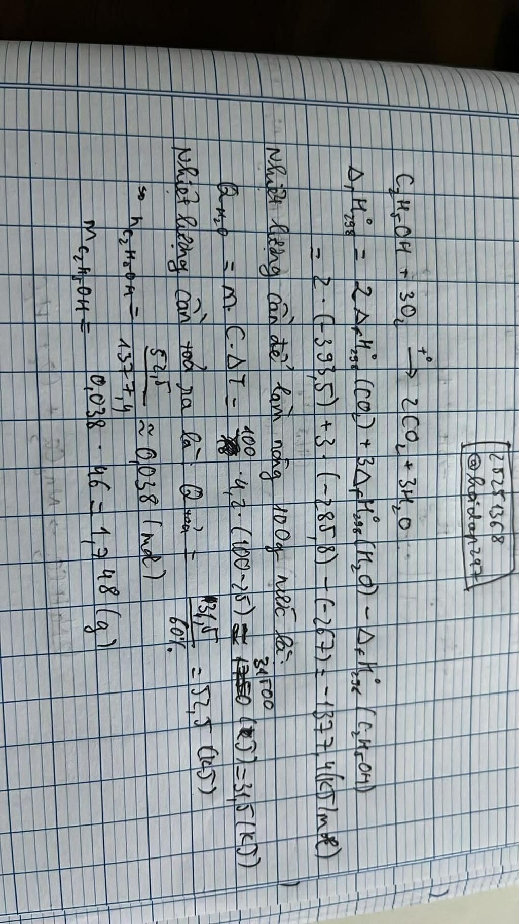`=>n_{C_2H_5OH}=(Q_{C_2H_5OH\text{ toả}})/(|\Delta_rH_{298}^{0}|)=(52,5)/(1377,4)~~0,038(mol)`