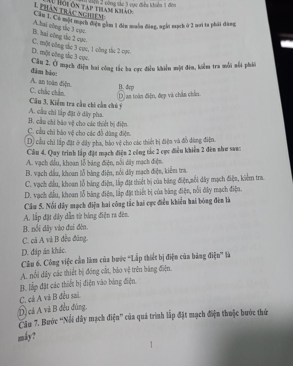 Câu 1. Có một mạch điện gồm 1 đèn muốn đóng, ngắt mạch ở 2 nơi ta phải dùng