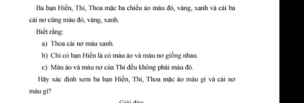 - Màu áo của bạn Hiền giống nhau ; màu áo của bạn Thi không phải màu đỏ.