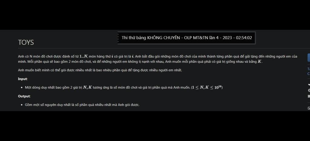Sau đó mình sẽ chạy một lượt k từ lớn đến nhỏ và kiểm tra bao nhiêu phần quà với giá trị K đó.