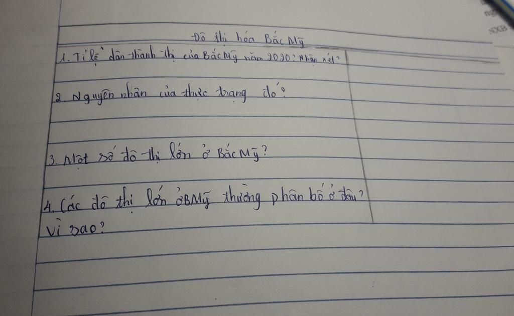 Câu 4. Đô thị ở Bắc Mĩ gắn liền với quá trình công nghiệp hóa và phát triển nhanh, tỉ lệ dân thành thị tăng nhanh, chiếm trên 76%. Phần lớn các thành phố nằm ở phía Nam vùng Hồ lớn và ven Đại Tây Dương, nối tiếp nhau tạo thành 2 dải siêu ô thị, từ Bôx-tơn đến Oa-sinh-tơn, từ Si-ca-gô đến Môn-trê-an