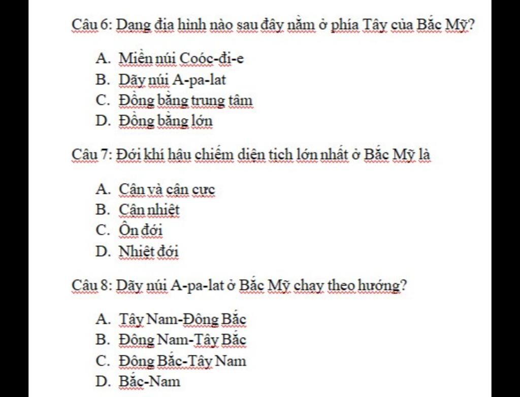 (Vì đáp án B, dãy núi A - pa - lat nằm ở phía Đông của Bắc Mỹ.