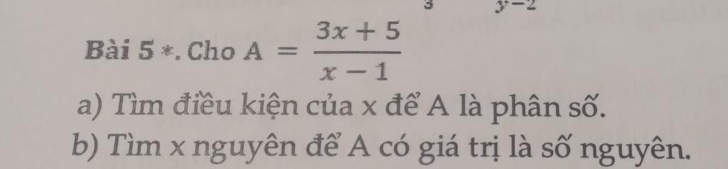 `b)` Để `A` có giá trị là số nguyên thì `(3x+5)/(x-1)` nguyên
