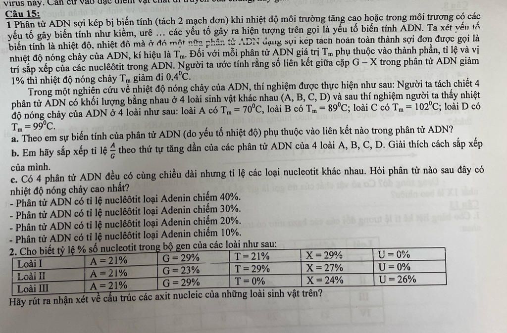 1 Phân tử ADN sợi kép bị biến tính (tách 2 mạch đơn) khi nhiệt độ môi trường tăng cao hoặc trong môi trương có các