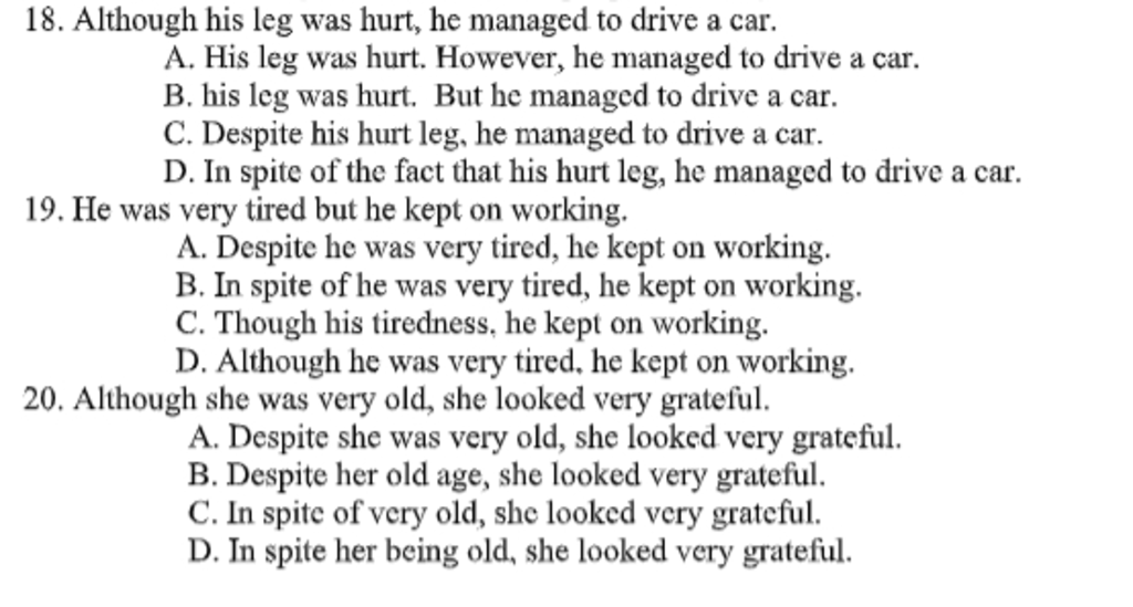 D. In spite of the fact that his hurt leg, he managed to drive a ca ...