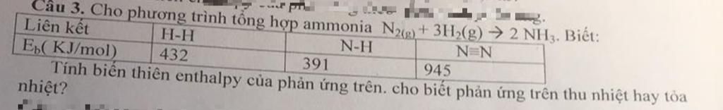 Tính biến thiên enthalpy của phản ứng trên là