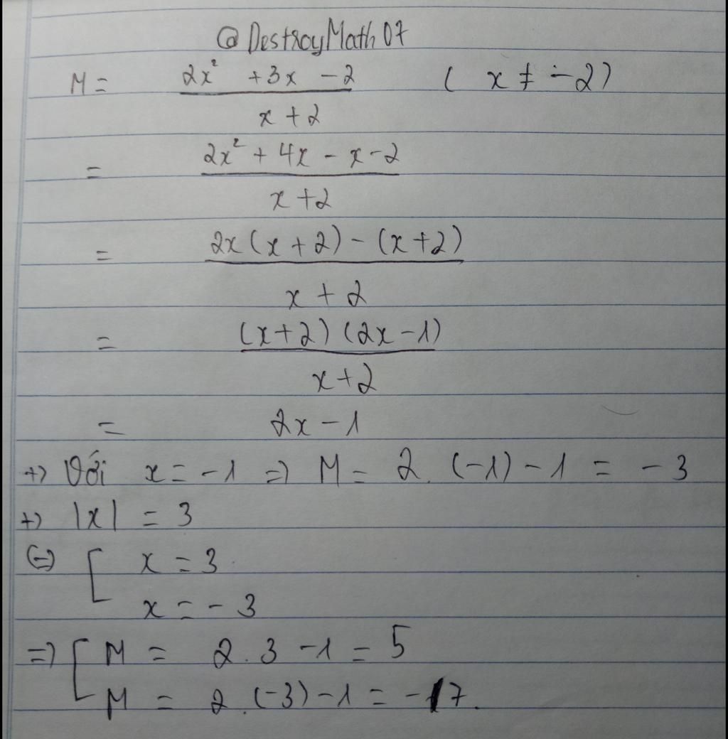 Thay `|x|=3` vào `M=2x-1` `<=>`\(\left[ \begin{array}{l}2.(3)-1=5\\2.(-3)-1=-7\end{array} \right.\)