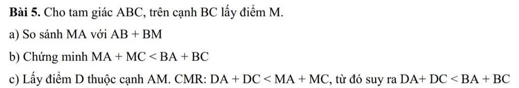 `a)` `MA < AB + BM` (bất đẳng thức tam giác)