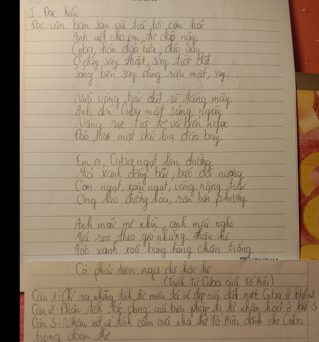 `-`Những tính từ miêu tả vẻ đẹp của đất nước Cuba ở khổ 2: rực, tơ, ngọc, tươi, đào