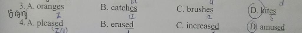 3. A. oranges B. catches C.brushes $\boxed{{D}}$.kites