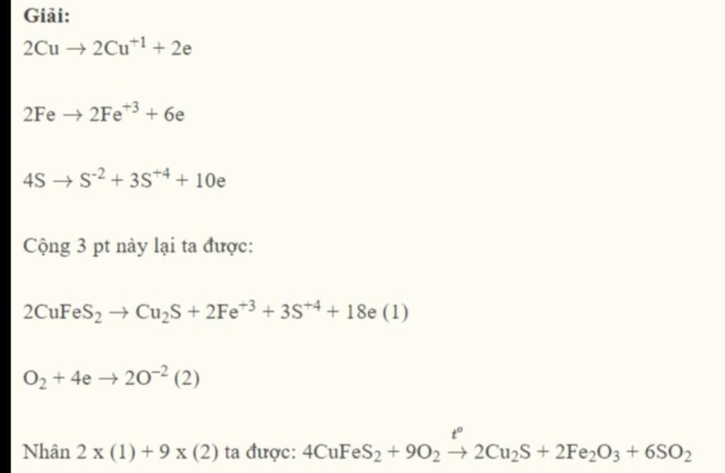Vì có $2Cu, 2Fe$ mà số $S$ gấp đôi số $Cu, Fe$ trong $CuFeS_2$ nên viết $4S$ ở vế trái. Có $2Cu$ nên có $1\mathop{S}\limits^{-2}$, vậy có $4-1=3\mathop{S}\limits^{+4}$.