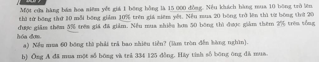 Đoạn đấy mình nhầm lời. Đề bài ra là từ bông thứ $20$ trở đi sẽ được giảm thêm $ 5\%$, thì mình sẽ tính xem có bao nhiêu bông tính từ bông $20$ đến bông $60$ để giảm.
