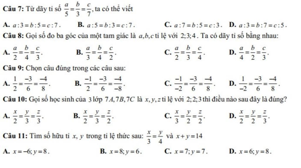 Câu 8: Gọi số đo ba góc của một tam giác là a,b,c tỉ lệ với 2;3;4. Ta có dãy tỉ số bằng nhau: