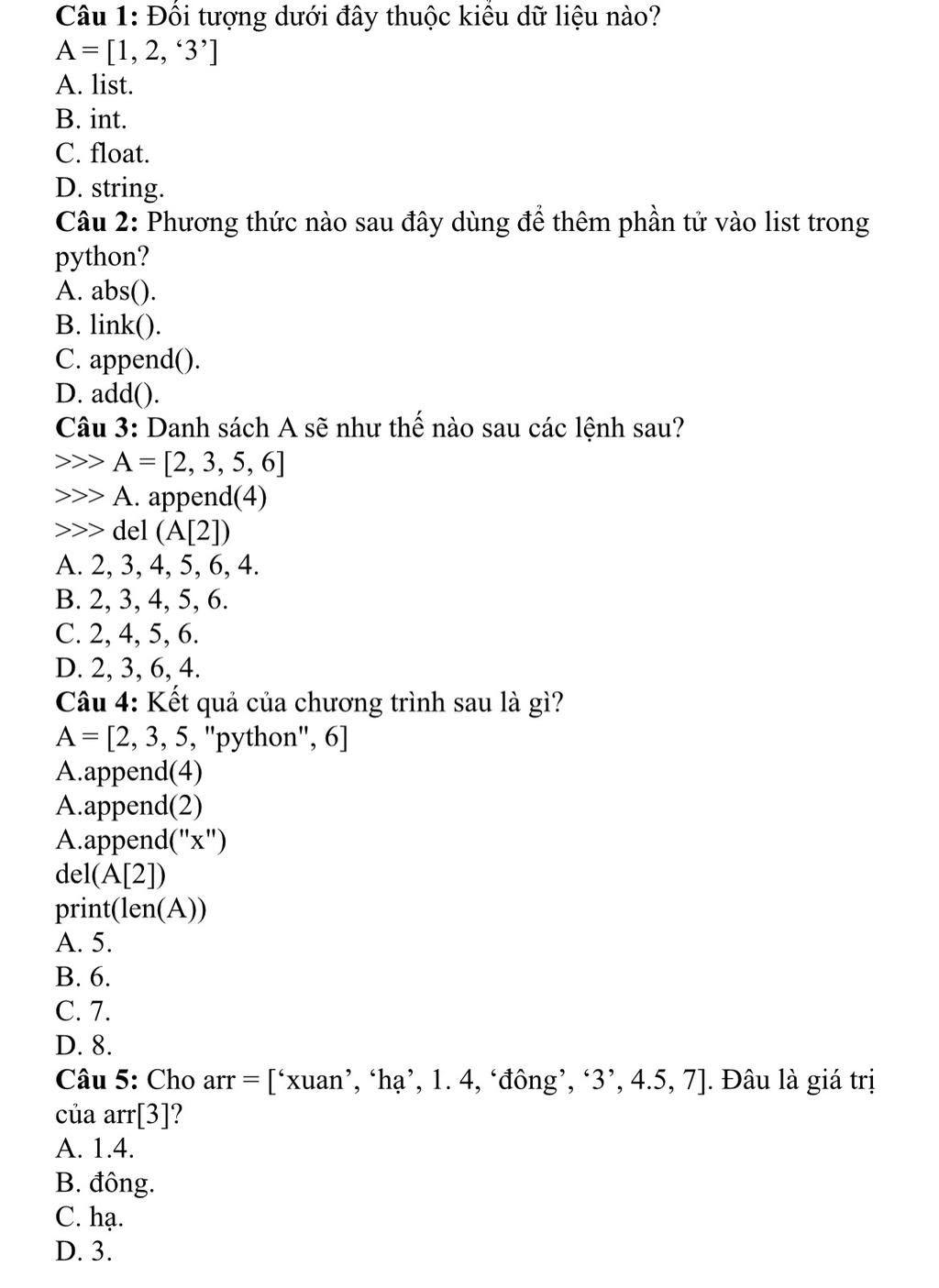 Câu 2: Phương thức nào sau đây dùng để thêm phần tử vào list trong
