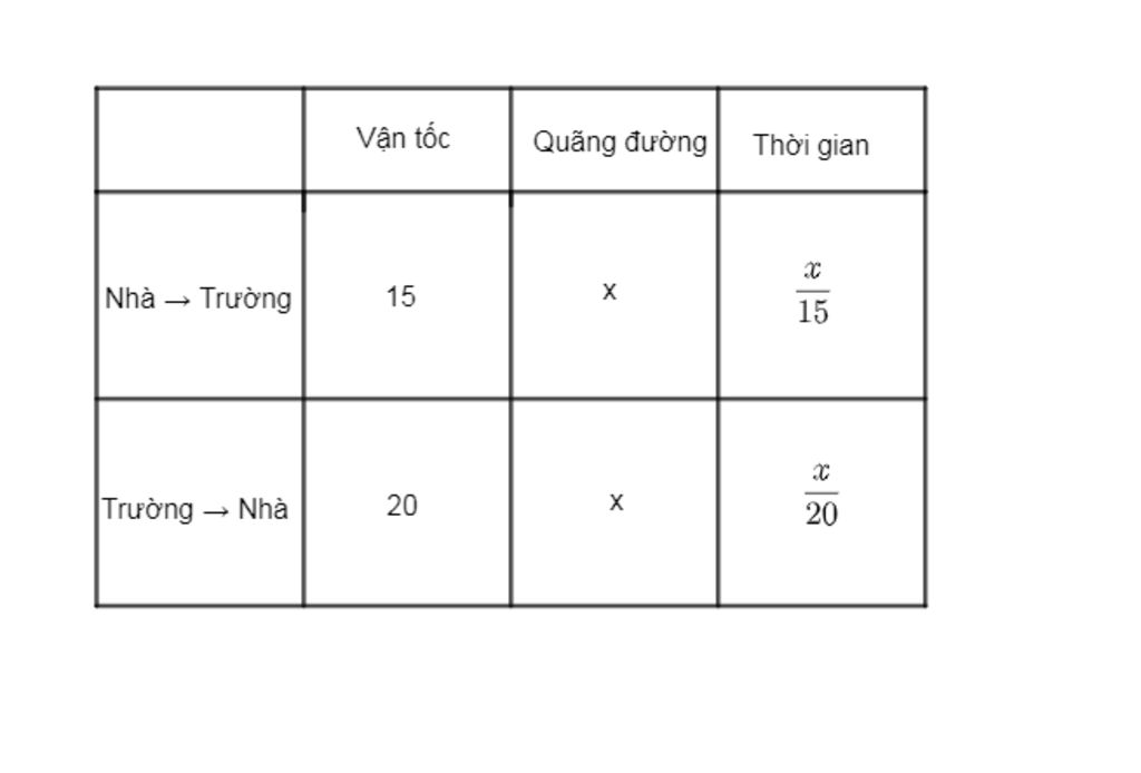 Vì thời gian đi nhiều hơn thời gian về là 15 phút nên ta có phương trình: