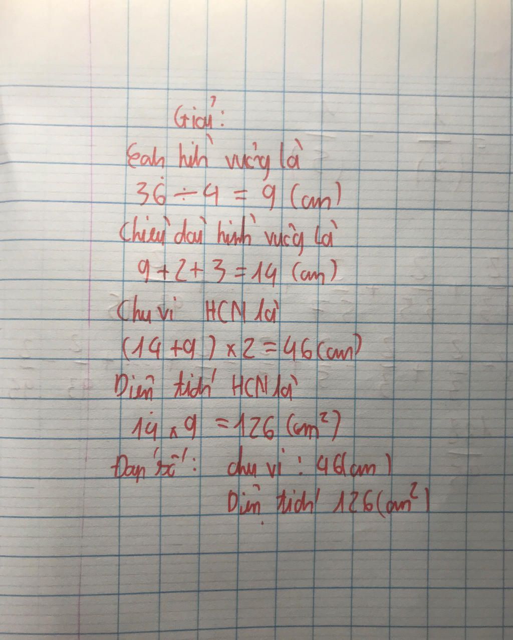 Diện tích hình chữ nhật là `126cm^2`