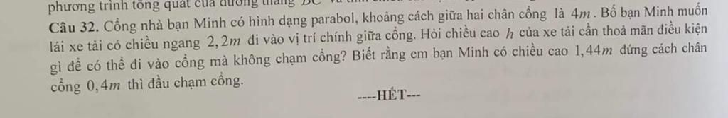 Câu 32. Cổng nhà bạn Minh có hình dạng parabol, khoảng cách giữa hai chân cổng là 4m. Bố bạn Minh muốn