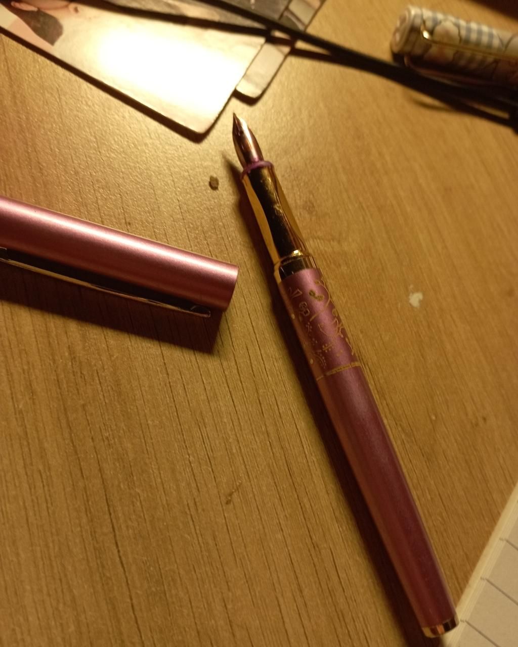 Mở nắp ra, chiếc ngòi sáng bóng ánh vàng hình nửa lá tre, ẩn dưới nó là thanh nhựa đen để dẫn mực. Phần trong thân bút là bộ phận chứa mực, nó thon dài như giống như ống tiêm của các cô y tá trong bệnh viện và cũng làm bằng nhựa trong để có thể kiểm tra mực dễ dàng. Em cho bút uống mực đầy và ướm thử. Em cảm thấy hơi nặng, nhưng rất vửa vặn và vui vui trong lòng.