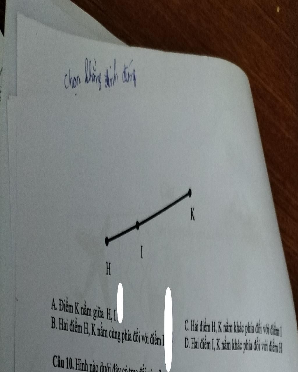 C. Hai điểm `H, K` nằm khác phía đối với điểm `I`: đúng (Vì `H, K` và là hai điểm đối nhau qua điểm `I` nên 2 điểm này nằm khác phía với điểm `I`).