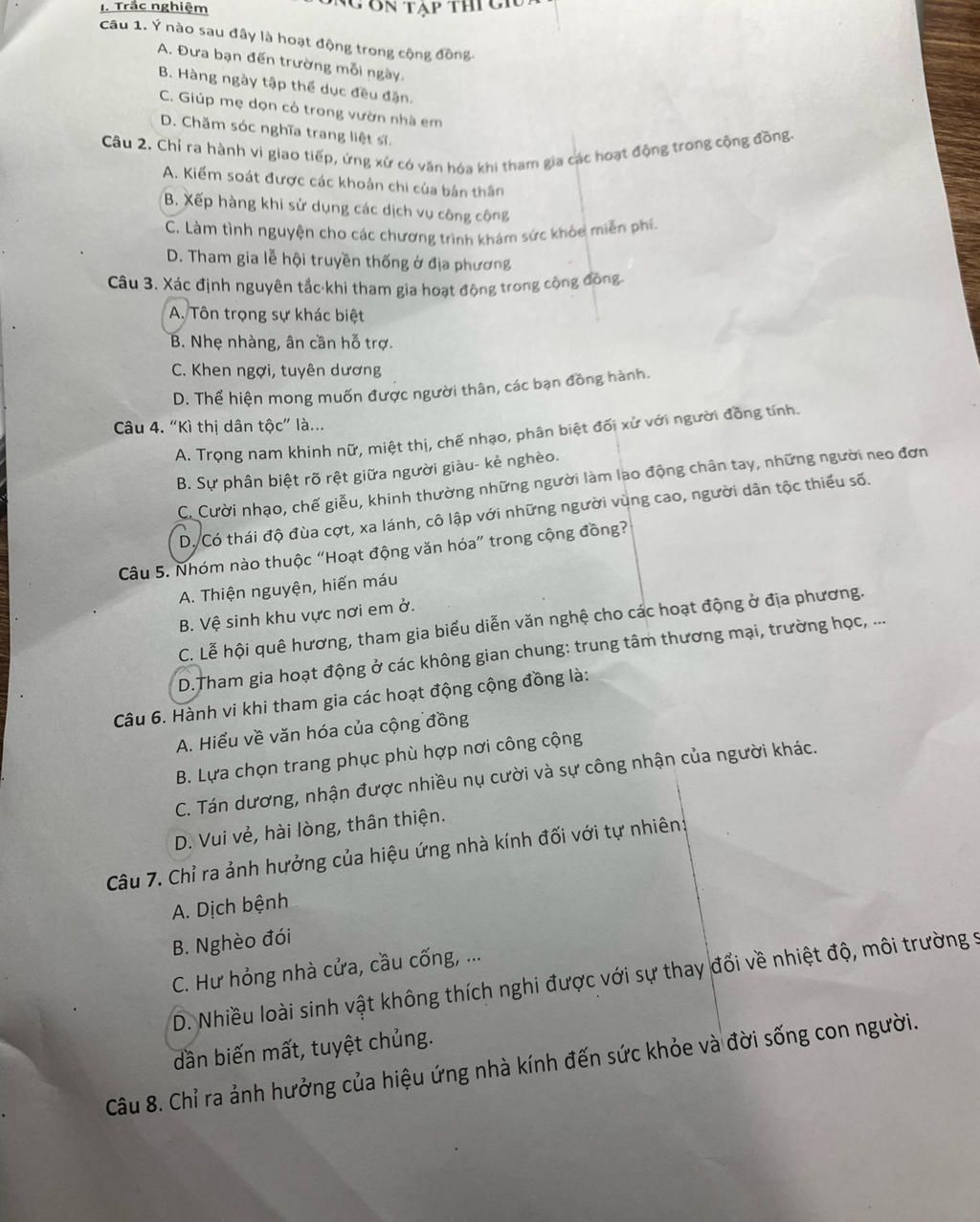 Câu 1: D. Chăm sóc nghãi trang liệt sĩ.