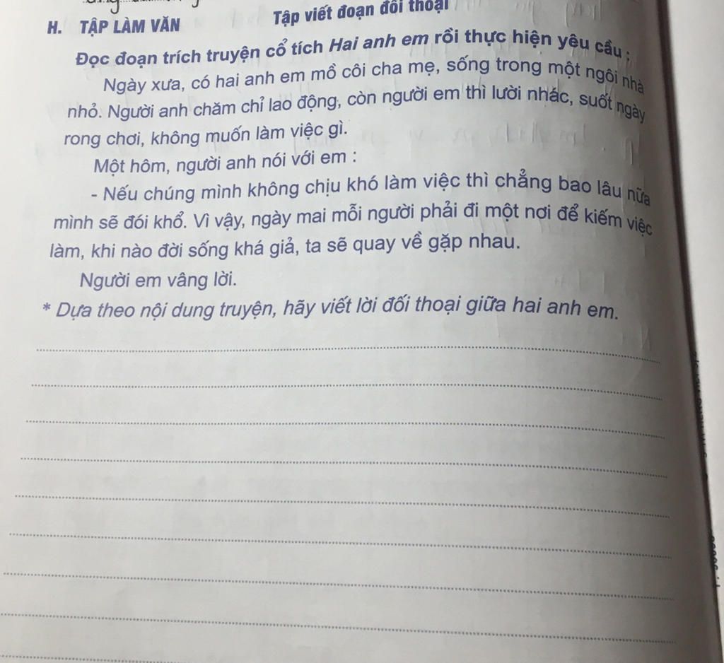 `-` Người em : Anh ơi, em xin lỗi! Bấy lâu nay em đã quá ham chơi mà không nghĩ đến cảm nhận của anh. Em đã hiểu lời anh nói rồi ạ, từ ngày mai em sẽ cố gắng chăm chỉ làm lụng hơn. Em sẽ không ỷ lại vào anh nữa, tự lo cho cuộc sống của riêng em. Anh nhé?