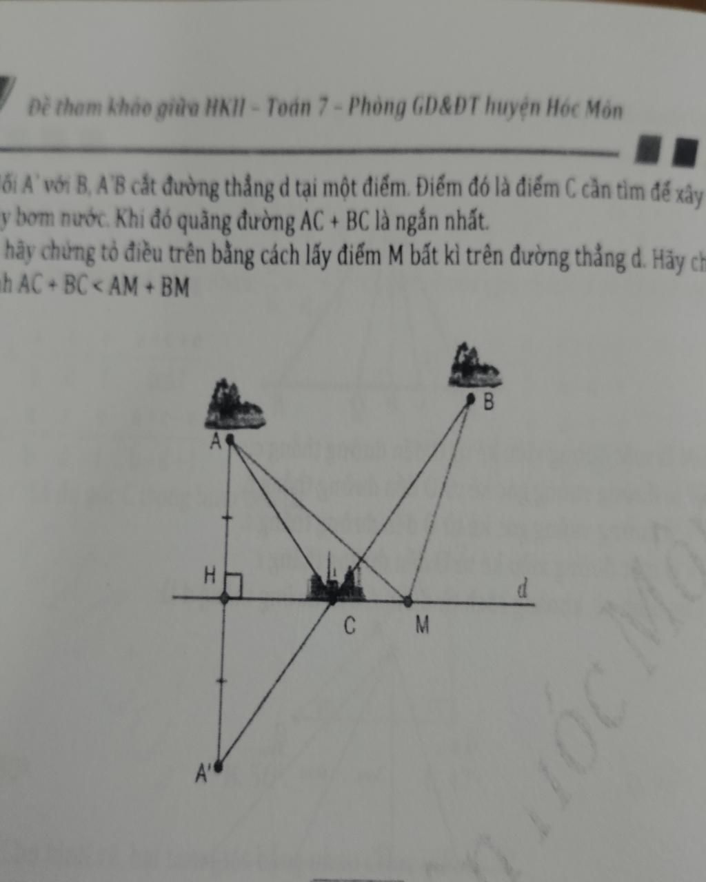 Em hãy chứng tỏ điều trên bằng cách lấy điểm M bất kì trên đường thẳng d. Hãy chứng minh AC + BC < AM + BM