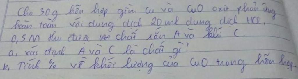 ta có: chỉ có CuO p/ứ vs HCl còn Cu ko p/ứ vs HCl. nên ta tính đc số mod của CuO. suy ra khối lượng của CuO. suy ra % kl của CuO.