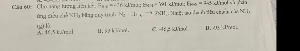 $=\dfrac{1}{2}.945+\dfrac{3}{2}.436-3.391=-46,5(kJ/mol)$