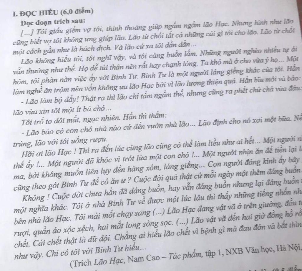 Nêu cảm nhận của Anh/chị về vẻ đẹp nhân cách của nhân vật Lão Hạc được thể hiện ở đoạn trích trên. ( Viết khoảng 5-7 dòng)