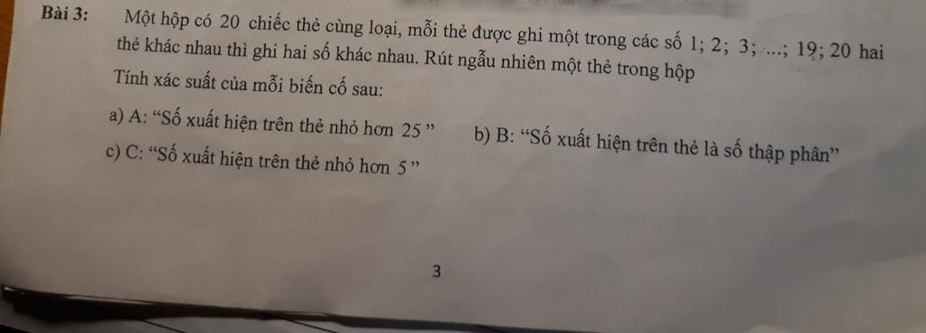 c) Có `4` kết quả cho biến cố `C`: " Số xuất hiện trên thẻ nhỏ hơn `5` là `1;2;3;4`. Xác suất của biến cố `C` là `\frac{3}{20}`.