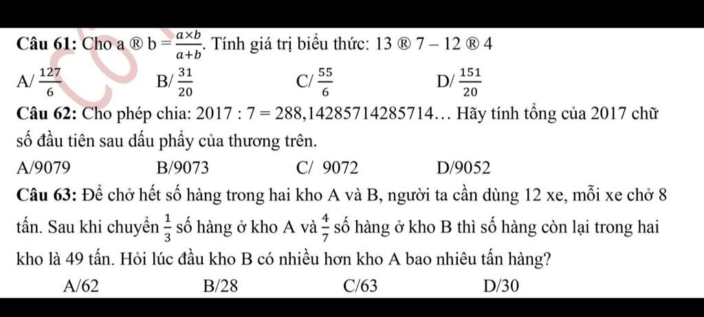 Câu 63: Để chở hết số hàng trong hai kho A và B, người ta cần dùng 12 xe, mỗi xe chở 8