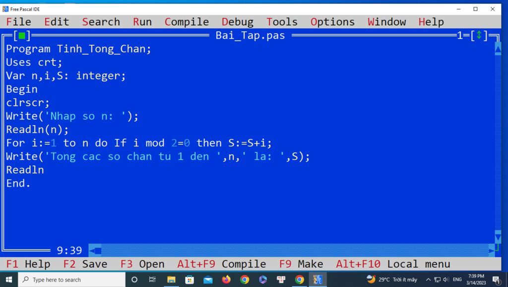 Program Tinh_Tong_Chan;Uses crt;Var n,i,S: integer;Beginclrscr;Write('Nhap so n: ');Readln(n);For i:=1 to n do If i mod 2=0 then S:=S+i;Write('Tong cac so chan tu 1 den ',n,' la: ',S);ReadlnEnd.