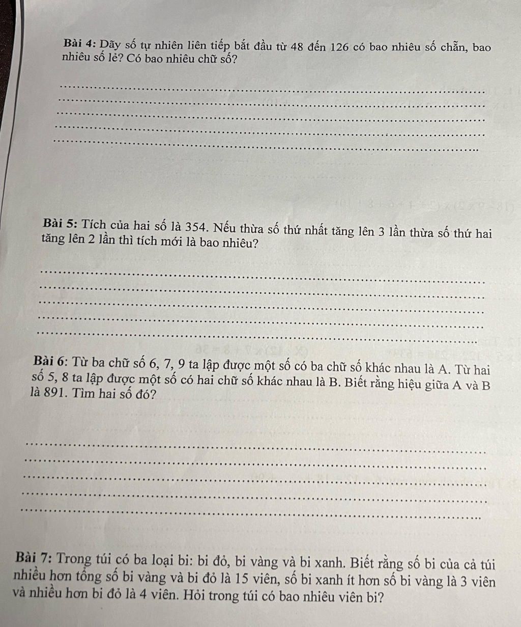 Câu 7: _ Vì số bi của cả túi nhiều hơn tổng số bi vàng và bi đỏ là 15 viên nên số bi còn lại là số bi xanh (15 viên)