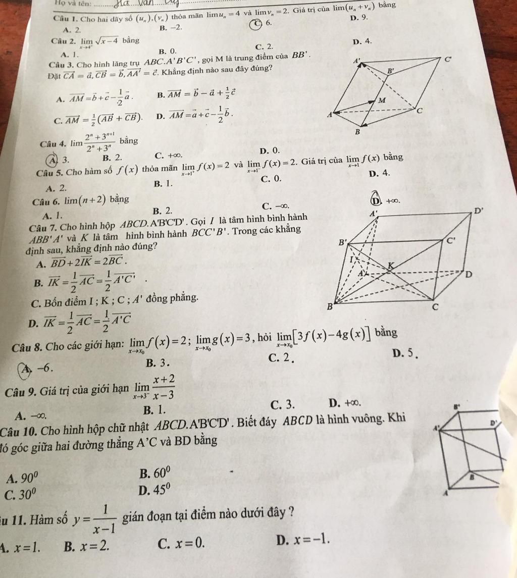 Câu 1. Cho hai dãy số (u, ),(v,) thỏa mãn limu, =4 và limv, = 2. Giá trị của lim(u, +V,) bằng