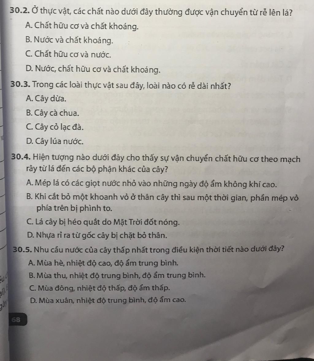 30.2 câu trã lời là D do nước và chất dinh dương chỉ có thể hấp thụ qua rễ