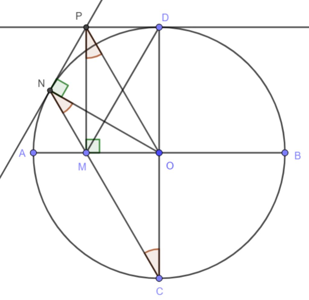 Ta có: $\widehat{OPM}=\widehat{ONM}$ (góc nội tiếp cùng chắn cung MO của đường tròn đường kính (PO))