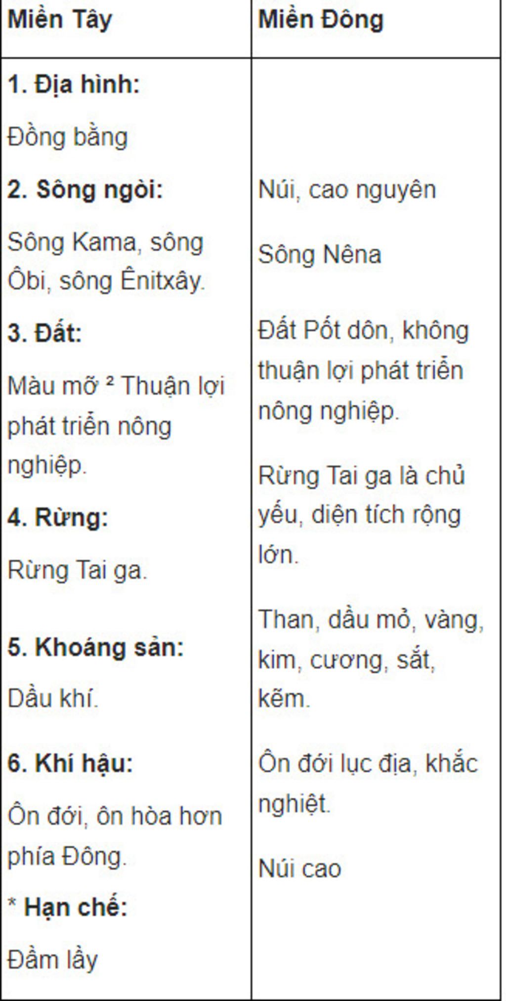 – Địa hình cao về phía đông, thấp về phía tây. Dòng sông Ê-nit-xây chia LB Nga thành hai phần rõ rệt: