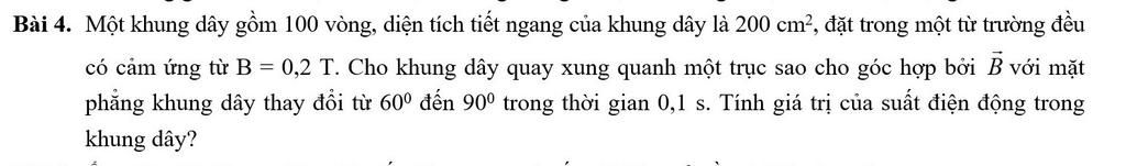 $N=100vong;S=200c{{m}^{2}}=0,02{{m}^{2}};B=0,2T;{{60}^{0}}\le \beta \le {{90}^{0}};t=0,1s$
