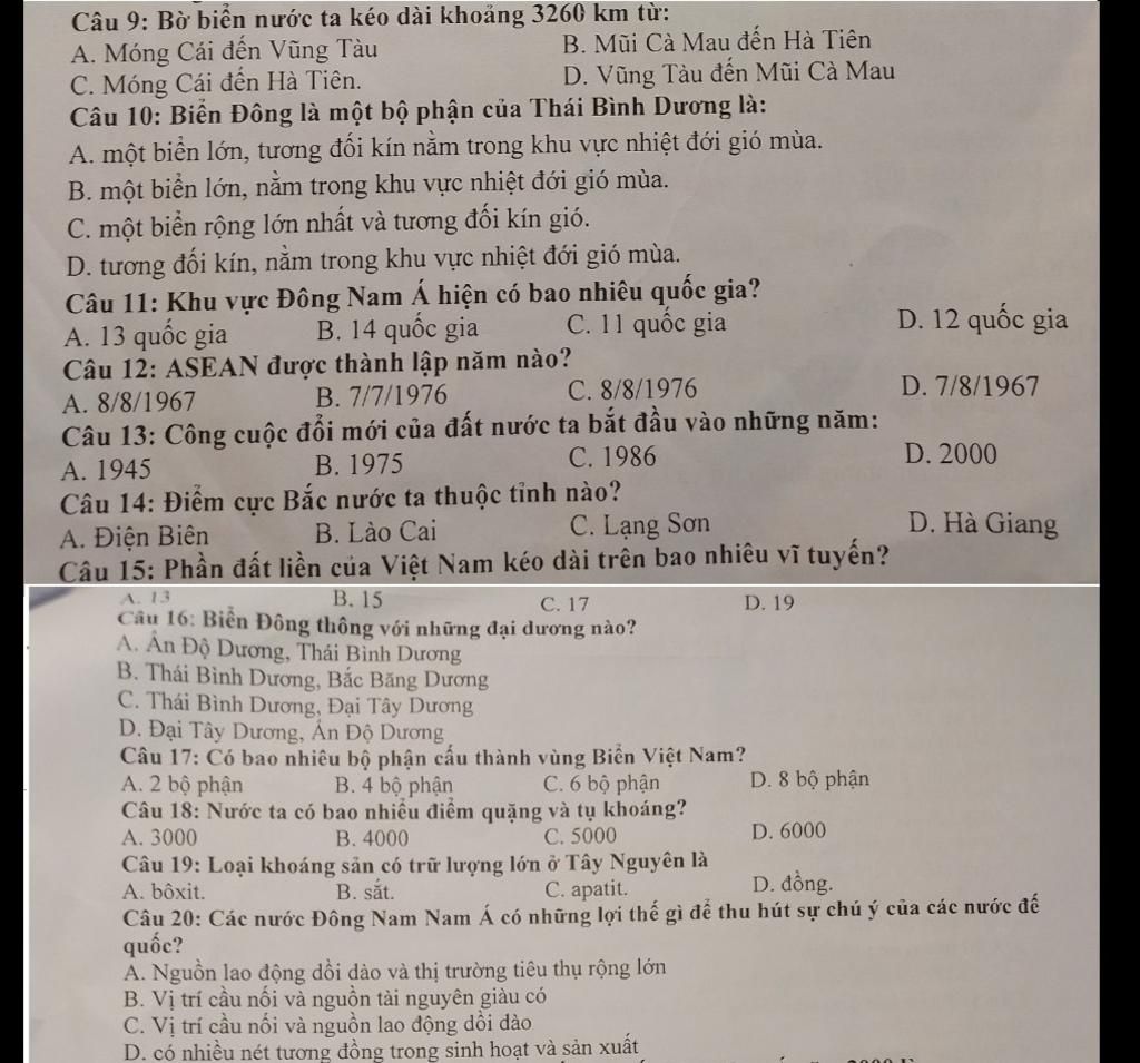 Câu 10:A.một biển lớn,tương đối kín trong khu vực nhiệt đới gió mùa.