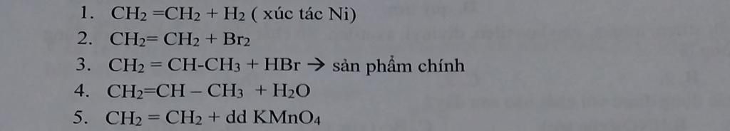 1. $CH_2=CH_2+H_2\xrightarrow{{Ni, t^o}} CH_3-CH_3$