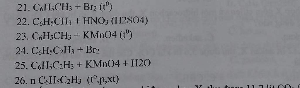 22. $C_6H_5CH_3+HONO_{2_đ}\xrightarrow{{H_2SO_4 đ, t^o}} H_2O+\left[ \begin{array}{l} o-O_2N-C_6H_4CH_3\\ p-O_2N-C_6H_4CH_3\end{array} \right.$
