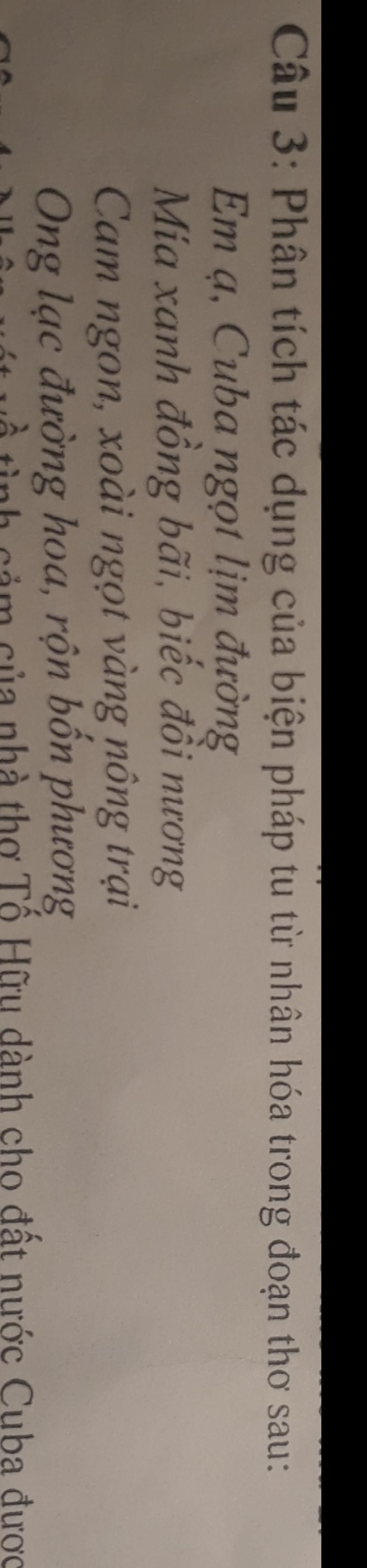 `=>`Tác dụng: Khắc họa hình ảnh đất nước Cuba với vẻ đẹp thiên nhiên, sự giàu có và trù phú. Sự vật trong câu thơ trở nên gần gũi, giàu sức sống. Qua đó, thể hiện tình cảm trân trọng, sự gắn bó của tác giả với mảnh đất Cuba.