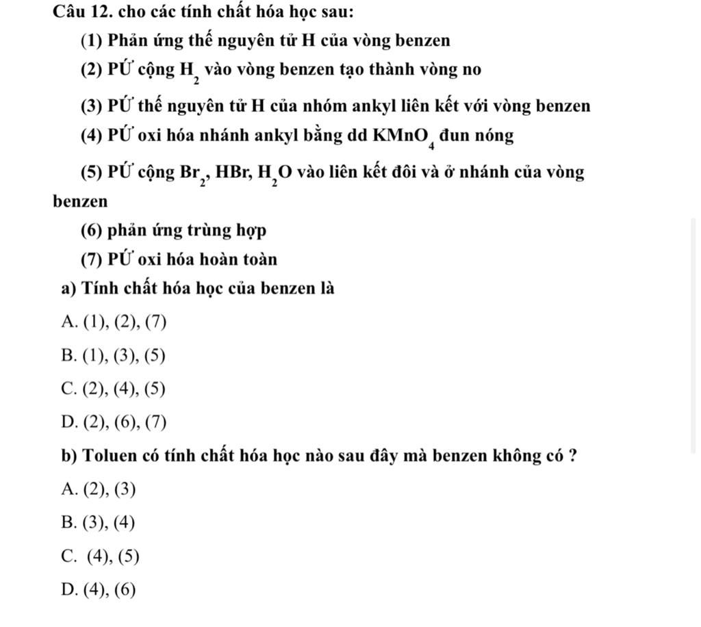 Toluen khác với benzen nhờ vào phản ứng với KMnO4 và Trùng hợp