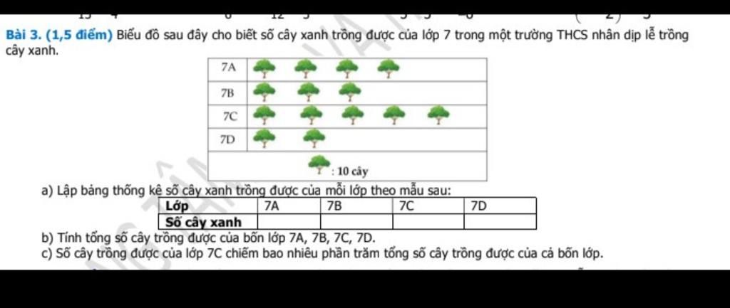 Bài 3. (1,5 điểm) Biểu đồ sau đây cho biết số cây xanh trồng được của lớp 7 trong một trường THCS nhân dịp lễ trồng