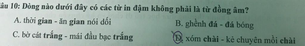"âu 10: Dòng nào dưới đây có các từ in đậm không phải là từ đồng âm?
