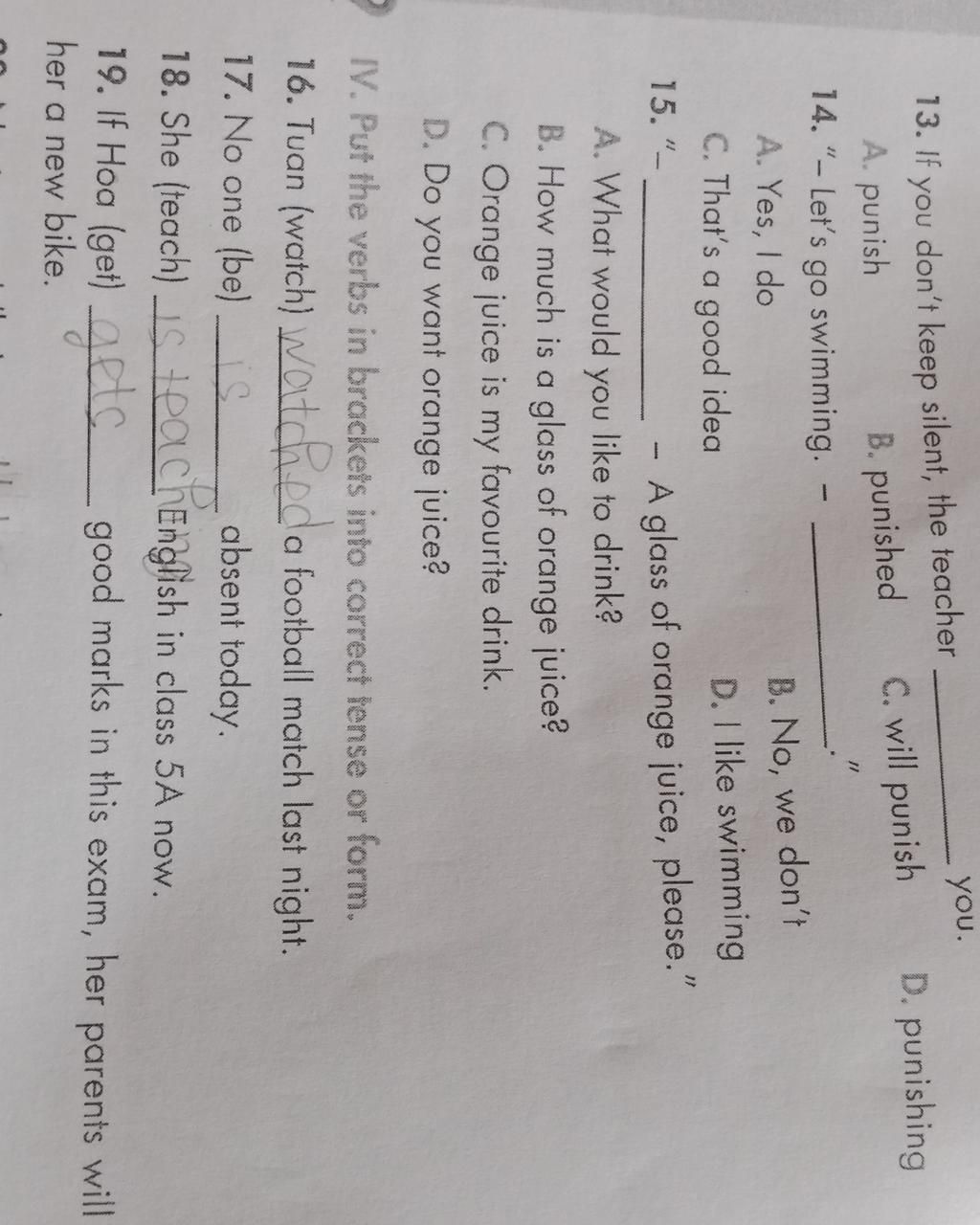 Giải thích : 13.Nêu bạn ko im lặng,cô giáo sẽ phạt bạn/14.Hãy đi bơi nào,đó là một ý tưởng tốt/15.Bạn muốn uống gì?,Xin vui lòng,cho tôi một cốc nước cam.