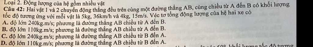 `=>` Véc tơ tổng động lượng của hai xe có : `{(\text{Độ lớn} : 110 kg.m//s ),(\text{Phương: Đường thẳng AB}),(\text{Chiều : Từ A đến B }):}`