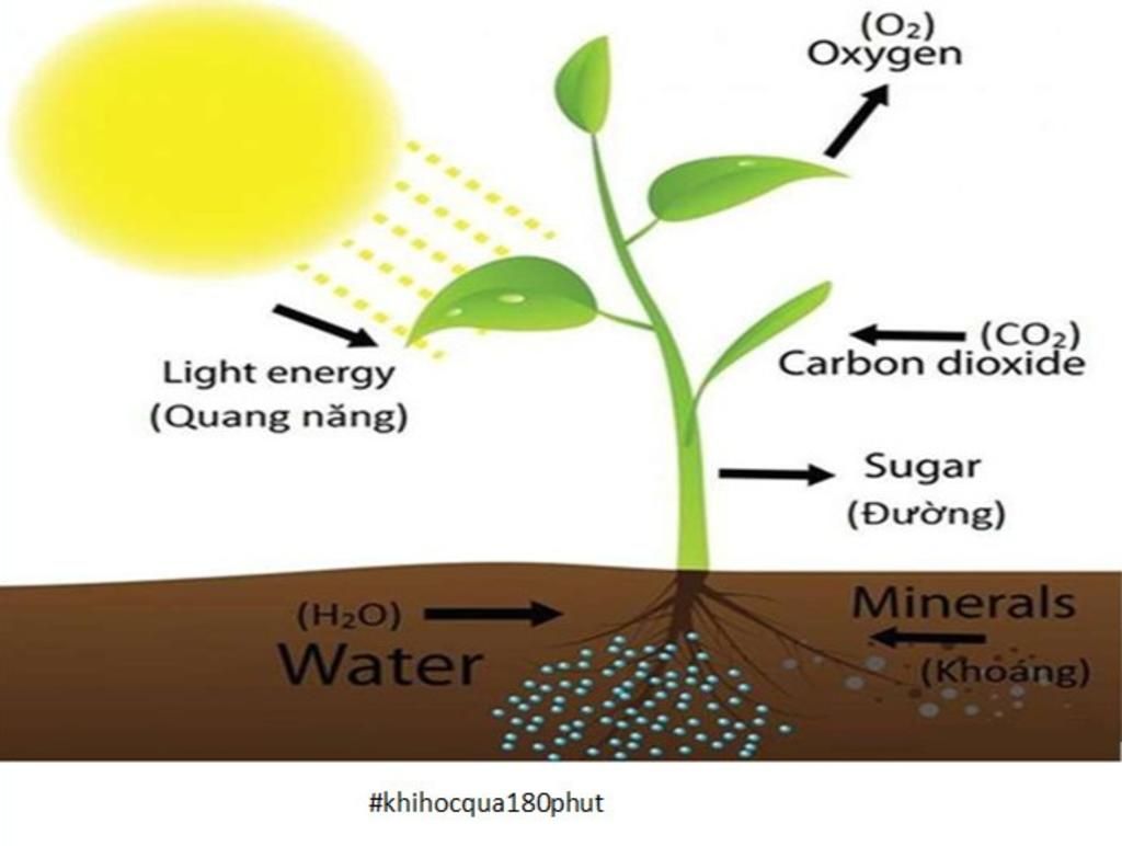 CO2 + nước (ánh sáng, diệp lục) → O2 + đường glucose.