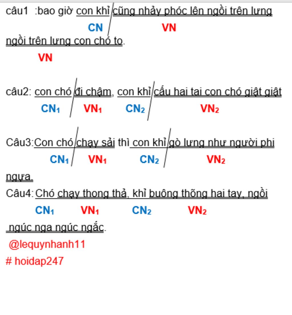 1) Mỗi lần dời nhà đi, bao giờ con khỉ / cũng nhảy phóc lên ngồi trên lưng con chó.