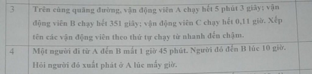 `=>` Sắp xếp từ nhanh đến chậm : vận động viên `A`; vận động viên `B`; vận động viên `C`